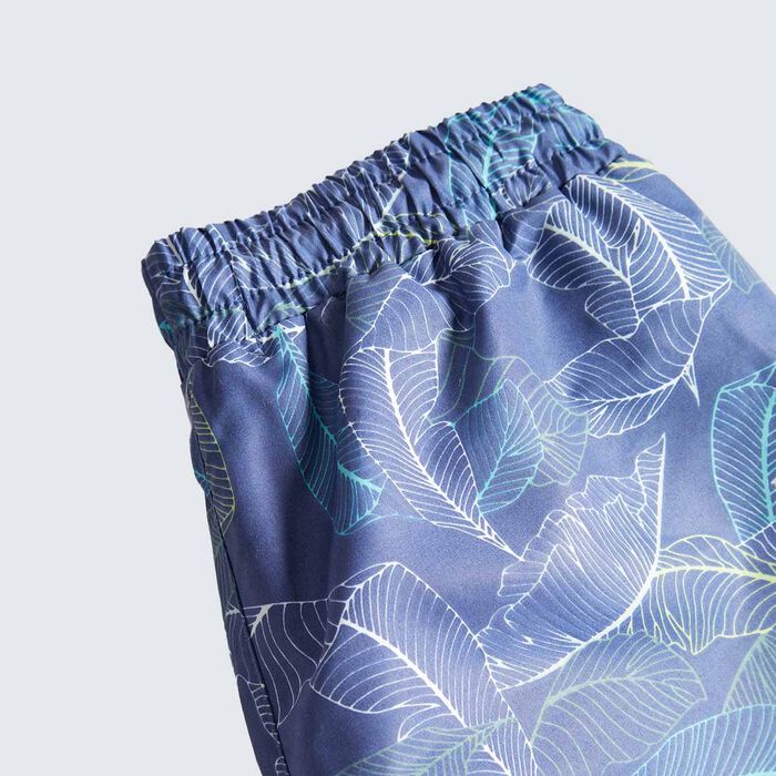 - Bermuda casual para niño, pretina resortada con cordón para ajustar, bolsillos en diagonal, textura lisa, silueta regular, estampado tropical de hojas.
