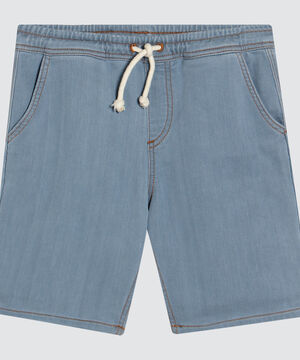 - Bermuda para Niño en jean tono azul claro con bolsillos diagonales. Prenda que no puede faltar en tu closet.