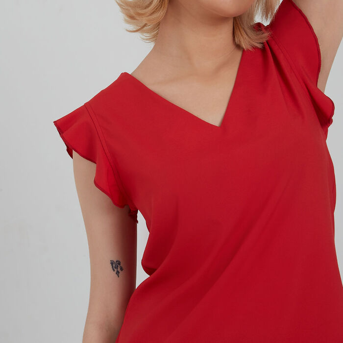 - Blusa para mujer con escote en v, manga corta con arandelas, silueta semi-ajustada, textura lisa, una prenda versátil que puedes usar con pantalones o jeans de diferentes estilos