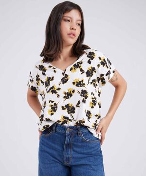 - Blusa manga corta para mujer con estampado floral en distintos tonos, escote en v, silueta amplia, textura lisa, diseño con hombro caído, elaborada en un material cómodo y ligero, úsala con jeans o pantalones de diferentes estilos