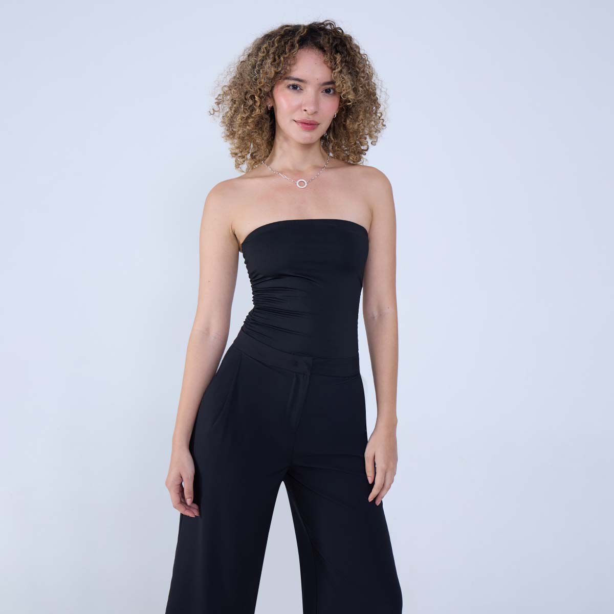 - Body para mujer con efecto drapeado en sus costados, escote strapless, manga sisa, espalda y hombros descubiertos, silueta ajustada, cobertura mínima en la parte trasera.