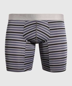 - Bóxer medio para hombre con diseño de rayas en tonos que se combinan, pretina ancha, cortes al frente, silueta ajustada.