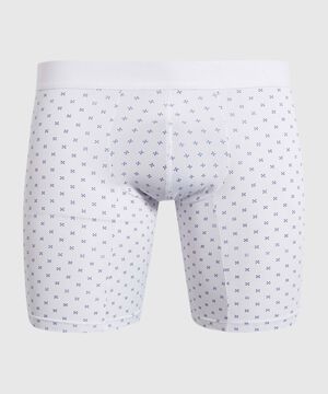 - Bóxer medio para hombre en microfibra, pretina ancha, textura lisa, silueta ajustada, cortes al frente, estampado de pequeñas figuras.