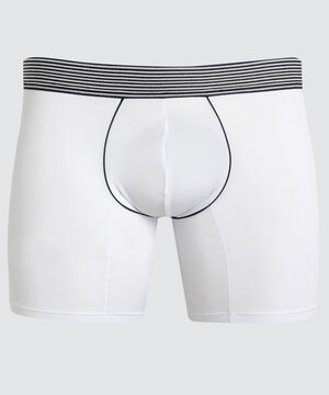 - Bóxer en microfibra unicolor, un material ultra suave y respirable, que te mantendrá libre de humedad todo el día. Realce con vena contrastada, brinda mayor soporte en el uso diario. Elástico de diseño a rayas bicolor, suave al contacto con la piel.