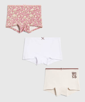 - Pack de 3 bóxers para niña en algodón, con diseños variados que incluyen estampado floral, screen gráfico y opción unicolor.