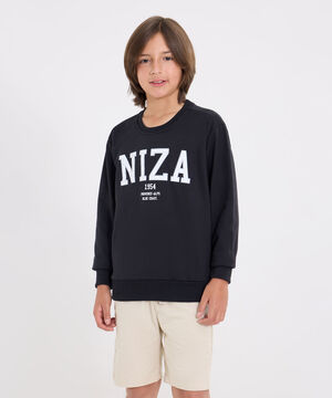 - Buzo para niño en color negro, con cuello redondo y estampado frontal tipo universitario con la palabra ""NIZA"".