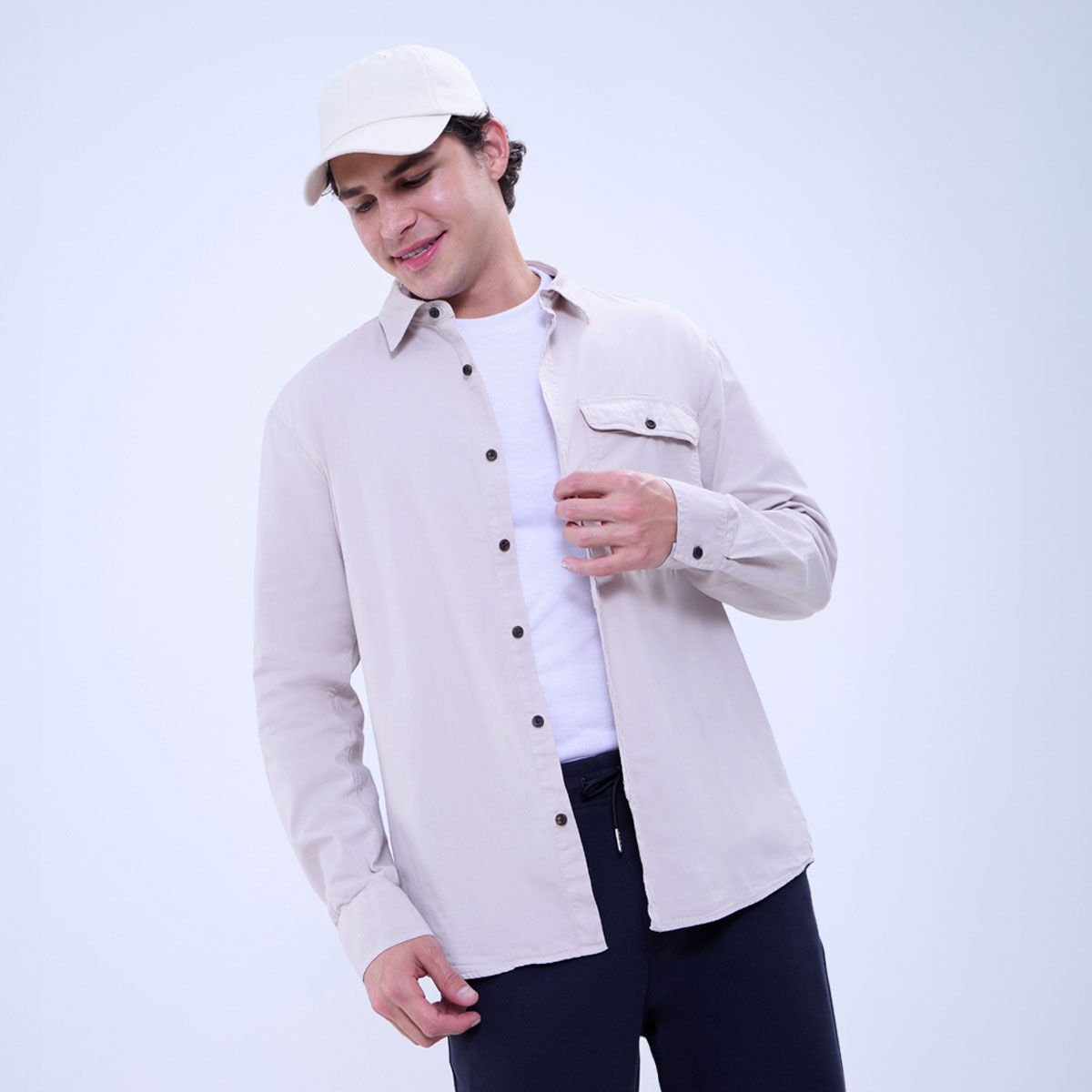 Camisa para hombre, manga larga, cuello camisero, silueta regular, textura lisa, botones que generan contraste, bolsillo de parche al frente.