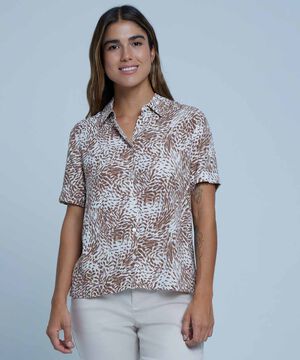 - Camisa manga corta para mujer con estampado de manchas en un tono marrón, textura lisa, cuello camisero, silueta amplia
