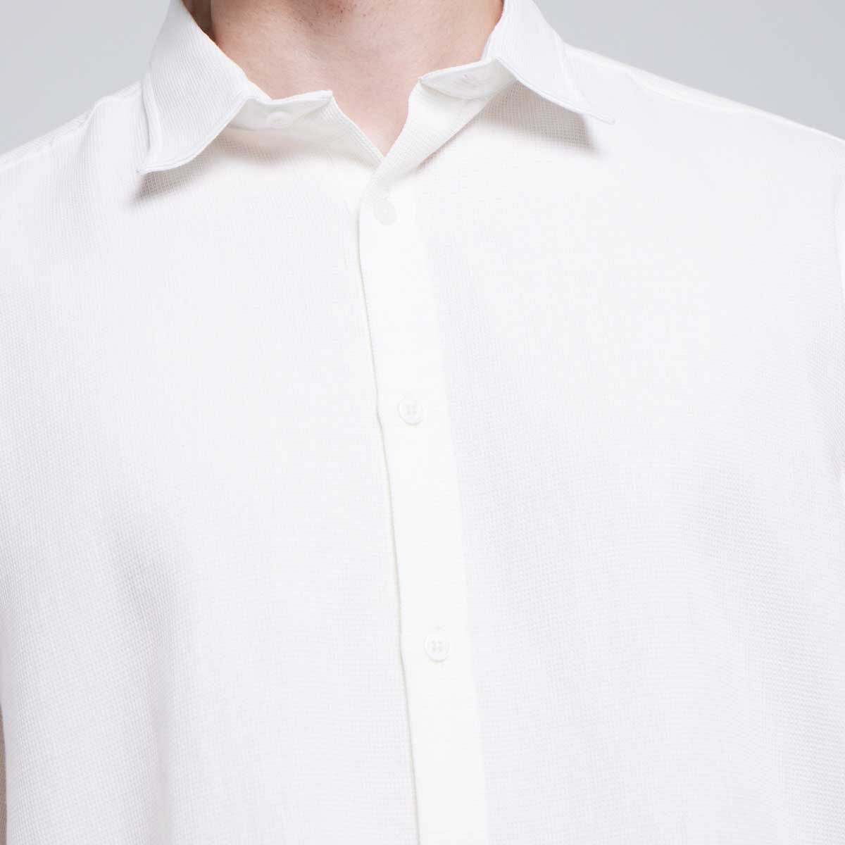- Camisa manga corta para hombre, cuello camisero, silueta amplia, botones en el mismo tono, textura de waffle.