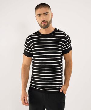 - Camiseta para mujer con manga corta y cuello redondo, en diseño de rayas horizontales blancas y negras que le dan un look atemporal y versátil.
