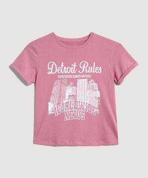 - Camiseta Manga Corta Para Niña Con Estampado De Detroit, Cuello Redondo, Textura Lisa, Silueta Regular.