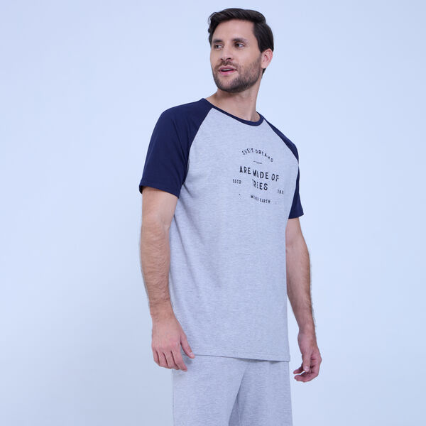 - Camiseta para hombre, manga corta tipo ranglán, cuello redondo, silueta regular, estampado en tendencia.
