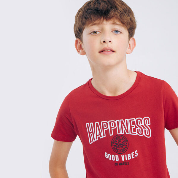 - Camiseta para niño, cuello redondo, manga corta, silueta regular, estampado localizado en frente.