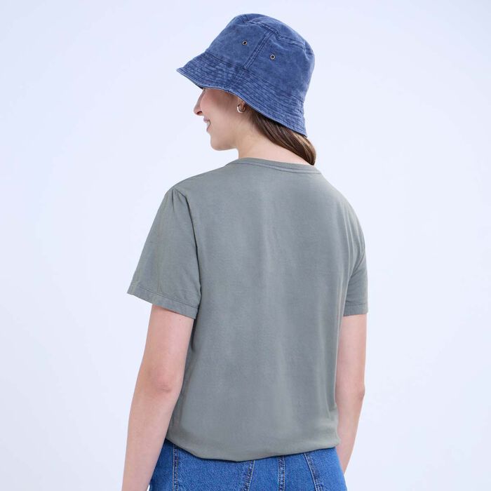 - Camiseta para mujer, cuello redondo, manga corta, textura lisa, silueta regular.