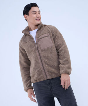 - Chaqueta polar para hombre, cuello alto, bolsillo al frente, cremalleras a tono, forro interior, puños ajustados, silueta regular.
