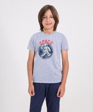 - Set de pijama para niño compuesto por camiseta gris de manga corta con estampado frontal de astronauta y la palabra “Space”, acompañado de pantalón largo azul oscuro con estampado geométrico.