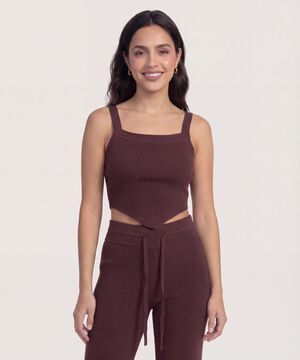 - Crop top para mujer, escote cuadrado, manga sisa con tiras anchas, hombros descubiertos, silueta ajustada, textura acanalada, terminación en punta.