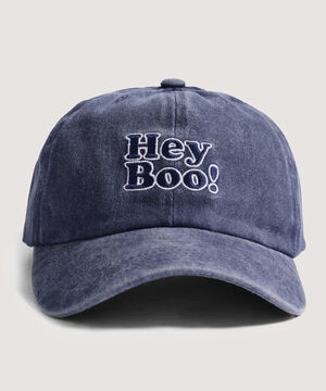 - Gorra beisbolera para hombre con desgastes de lavado, bordado Hey Boo, estructura de tapas, textura acanalada, correa ajustable en la parte trasera.
