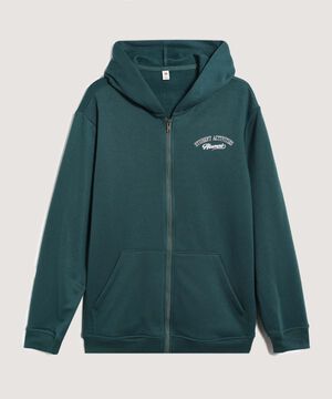 - Buzo básico para hombre, capota con cordones para ajustar, bolsillos de parche en los costados, silueta amplia, textura lisa, puños ajustados.