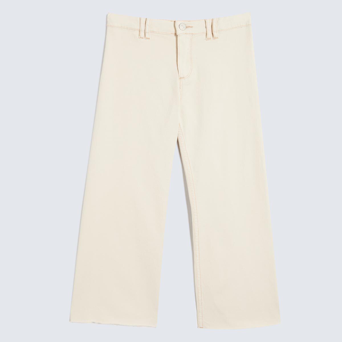 - Jeans culotte para niña, tono claro, tiro alto, cintura ajustada, altura hasta el tobillo, silueta amplia.