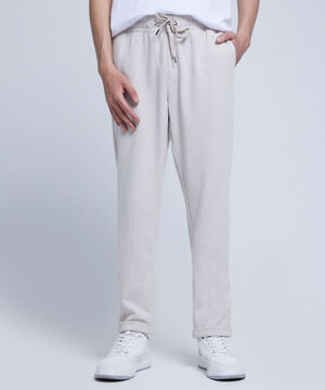 - Jogger para hombre con bolsillos cargo en los costados, tiro medio, silueta amplia, textura lisa, pretina resortada con cordón para ajustar.
