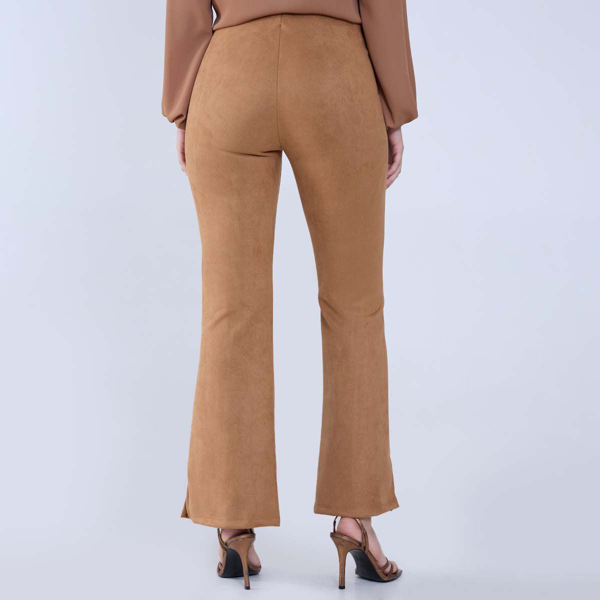- Leggins flare para mujer en efecto gamuzado, tiro alto, silueta ajustada, altura hasta el tobillo, botas acampanadas con aberturas.