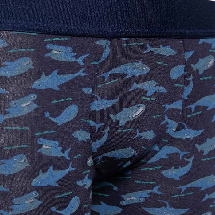- Pack x 3 bóxer medio para niño, pretina ancha, silueta ajustada, compuesto por bóxer en un tono sólido más dos con estampado de tiburones y maquinaria.