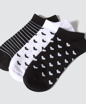 - Pack X 3 Medias Para Mujer Con Estampados De Corazones, Colores Diferentes, Suaves Y Cómodas, Úsalas Con Tenis O Zapatos Casuales. Hechas En Algodón, Poliéster Y Elastano. ¡Agrégalas Fácilmente Al Carrito De Compras!