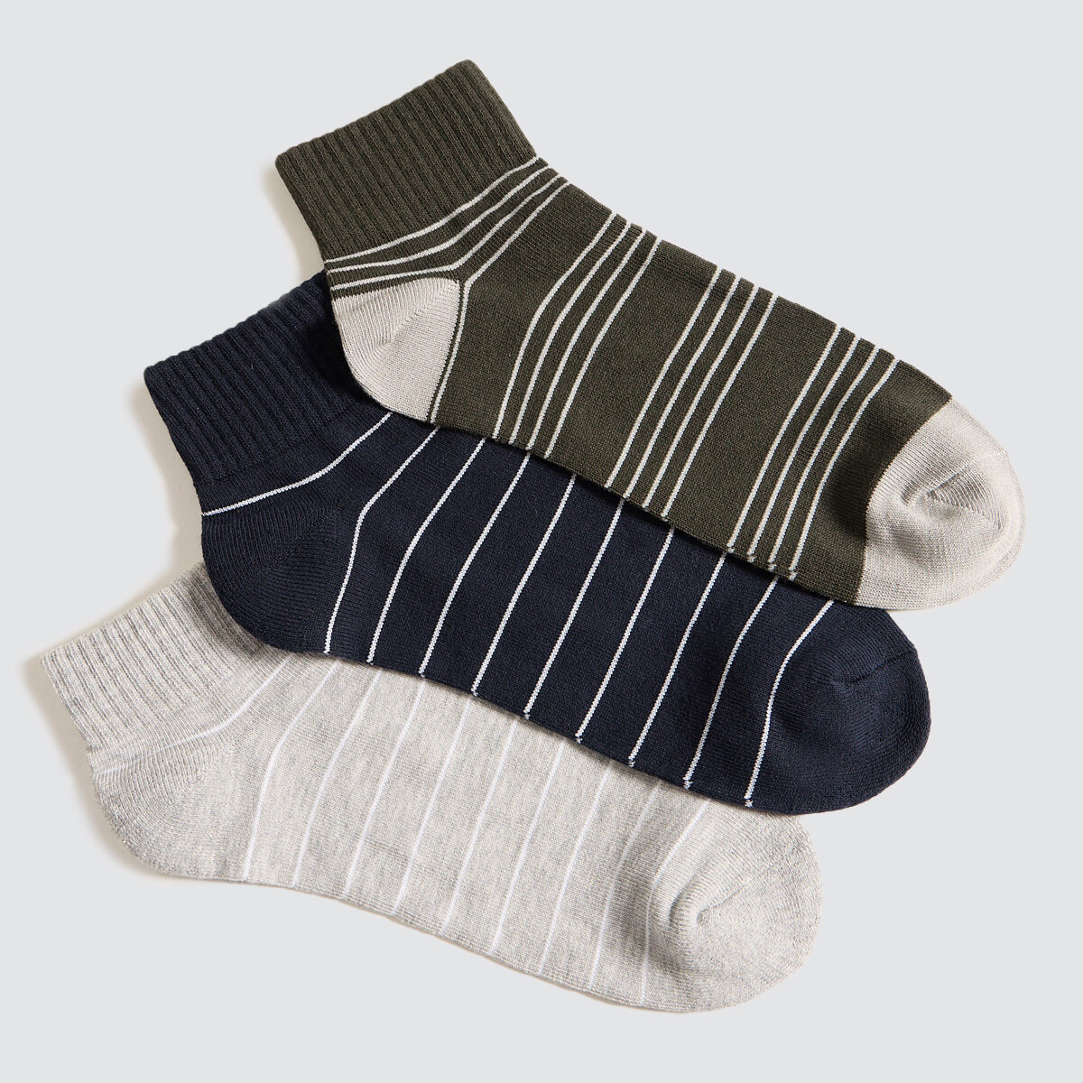 - Pack x 3 de medias tobilleras para Hombre, diseño con estampado rayas en diferentes tonos, textura acanalada en la entrada, talón y punta con refuerzo.