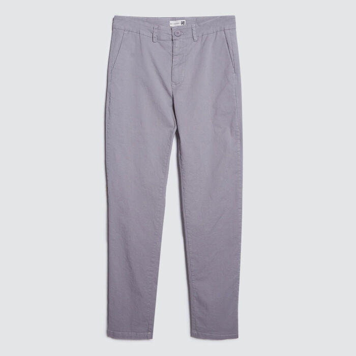 - Pantalón tipo chino para hombre, tiro medio, silueta semi-ajustada desde la cadera a la bota, altura hasta el tobillo, textura lisa, bolsillos en diagonal