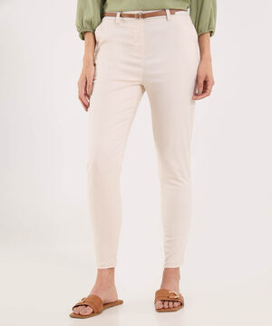 - Pantalón tipo chino para mujer, tiro alto, silueta ajustada desde la cintura a la bota, textura lisa, altura hasta arriba del tobillo, bolsillos en los costados.