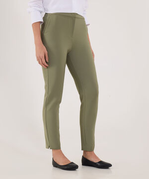 - Pantalón casual para mujer, tiro alto, cintura ajustada, textura lisa, bolsillos en diagonal, silueta semiajustada desde la cadera a la bota, altura hasta el tobillo.