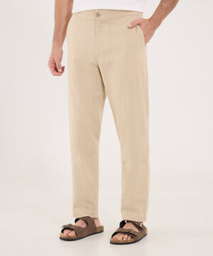 - Pantalón para hombre en tono beige, con pretina parcialmente encauchada en la parte trasera, cordón interno y cierre con cremallera.