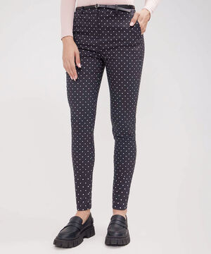 - Pantalón tipo chino para Mujer estampado, tiro alto, silueta ajustada desde la cintura a la bota, textura lisa, altura hasta arriba del tobillo, bolsillos en los costados.