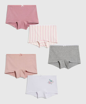 - Pack de cinco panties tipo bóxer para niña, con diseños surtidos en tonos pastel y rayas suaves.