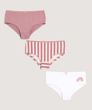 - Incluye una prenda blanca con estampado de arcoíris en tonos rosa, una de rayas rosa y beige, y una unicolor rosa.