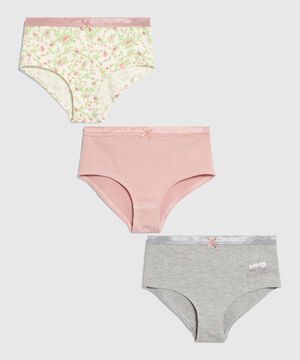 - Pack de pantys para niña con tres diseños: uno estampado floral, uno unicolor y uno con frase estampada “You Are Beautiful”.