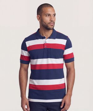 - Polo para hombre con diseño a rayas en tonos oscuros y claros, confeccionado en tejido tipo piqué preteñido.