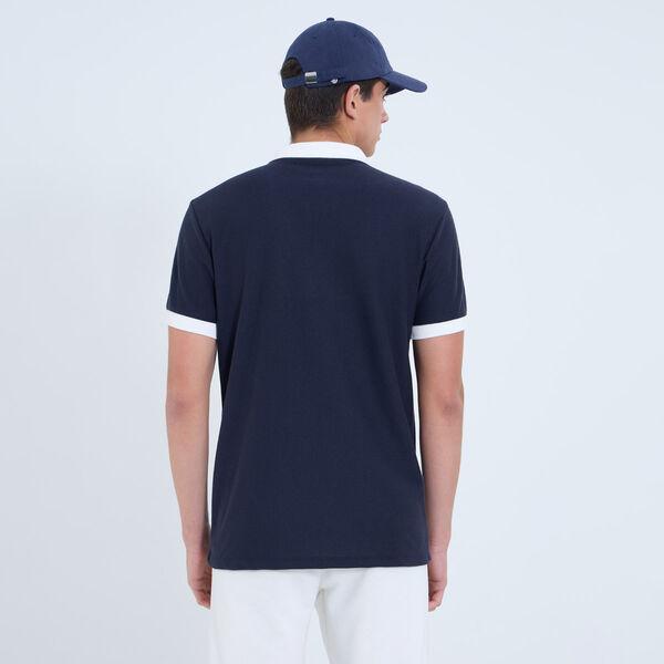 - Polo para hombre, cuello tejido, manga corta, silueta regular, estructura de bloques en dos tonos.