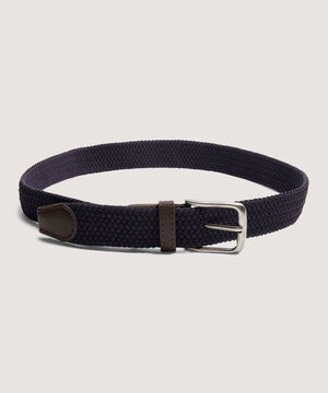 - Reata elastica tejida para hombre, textura trenzada, ajustable sin huecos, acabados en efecto cuero, hebilla metálica en forma rectangular en un tono plateado.