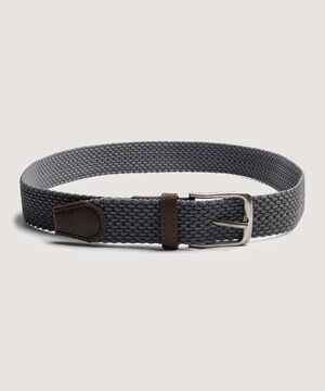 - Reata elastica tejida para hombre, textura trenzada, ajustable sin huecos, acabados en efecto cuero, hebilla metálica en forma rectangular en un tono plateado.