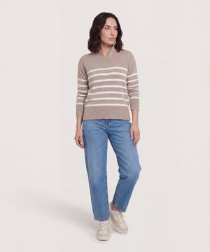 - Saco tejido para mujer, cuello alto, pechera con cremallera, ruedo y puños acanalados, franjas horizontales en su estructura, silueta amplia.
