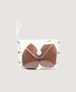 - Set de dos esponjas para maquillaje en tono azul claro, con diseño ergonómico tipo gota que permite una aplicación uniforme en todo el rostro.