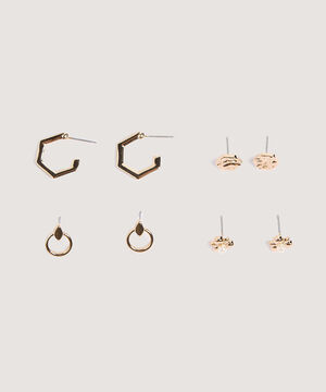 - Set x 4 de aretes para mujer en un tono dorado, compuestos por diferentes diseños que te permitirán realizar distintas combinaciones con tus looks casuales.