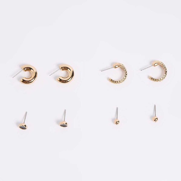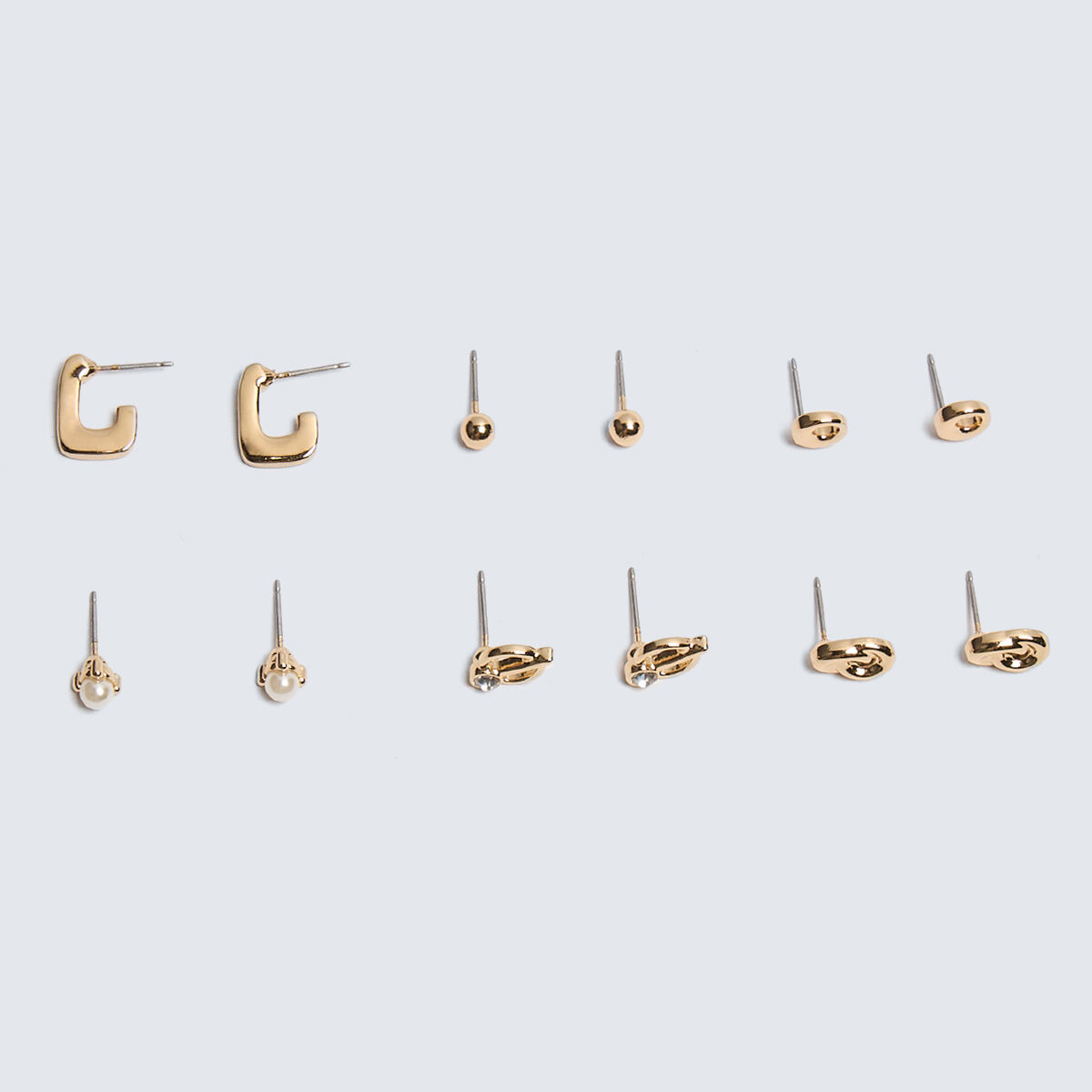 - Set x 6 de aretes para mujer en un tono dorado, compuesto por diseños variados con incrustaciones en vidrio y plástico, úsalos para resaltar tus looks casuales.