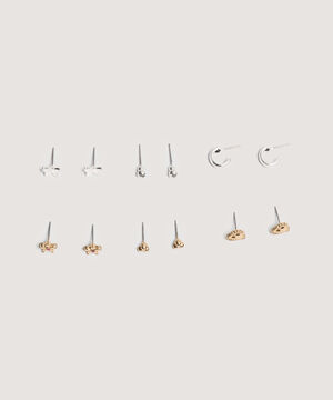 - Set x 6 de aretes para mujer en dos tonos, compuesto por diferentes diseños en tamaños pequeños con brillos, úsalos para resaltar tus looks casuales.