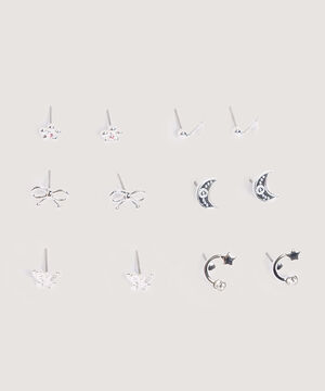 - Set x 6 de aretes para mujer en un tono plateado, compuestos por diferentes diseños que te permitirán realizar distintas combinaciones con tus looks casuales.