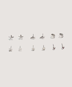 - Set x 6 de aretes para mujer en un tono plateado, compuesto por diseños con temática marina, úsalos para resaltar tus looks casuales.