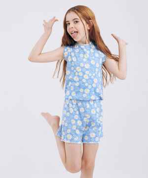 - Este Short Básico De Fondo Azul Para Niña Con Estampado De Flores Es Una Prenda Perfecta Para El Descanso De Las Niñas, Cómoda Y Suave Ideal Para Climas Cálidos Y Frescos. Hecho En Poliéster Y Algodón. ¡Llévala Fácilmente Agregándola Al Carrito!