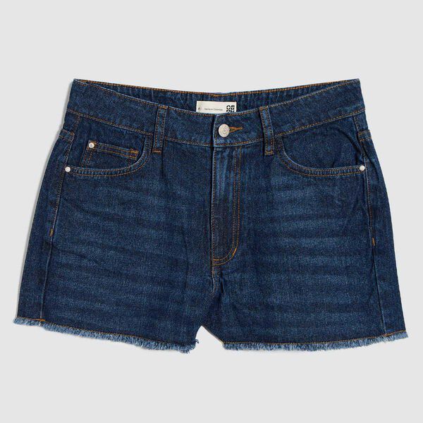 - Short en denim para mujer, silueta relax, tono oscuro, tiro alto, silueta ajustada, bolsillos funcionales, botas con ruedo suelto.